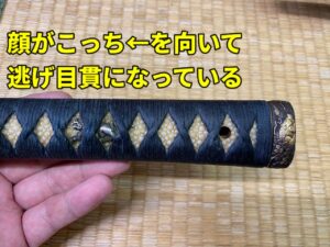 動物等生き物の目貫を入れる場合は顔の向きが刀身に向くように入れます。反対に入れてしまうと逃げ目貫と言って大変縁起が悪いです。